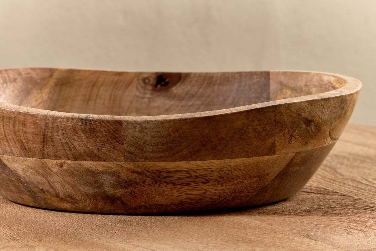 The striking organic shape of our Adar mango wood bowl is reminiscent of traditional Indian antiques and will addauthentic and unadorned simplicity to your kitchen countertop or as a centrepiece to a table. Entirely food-safe, thispiece makes a perfect fruit bowl or is ideal for serving salads and vegetable dishes. The variety of sustainable mangowood offcuts used to create each bowl gives a unique look and feel to each one.