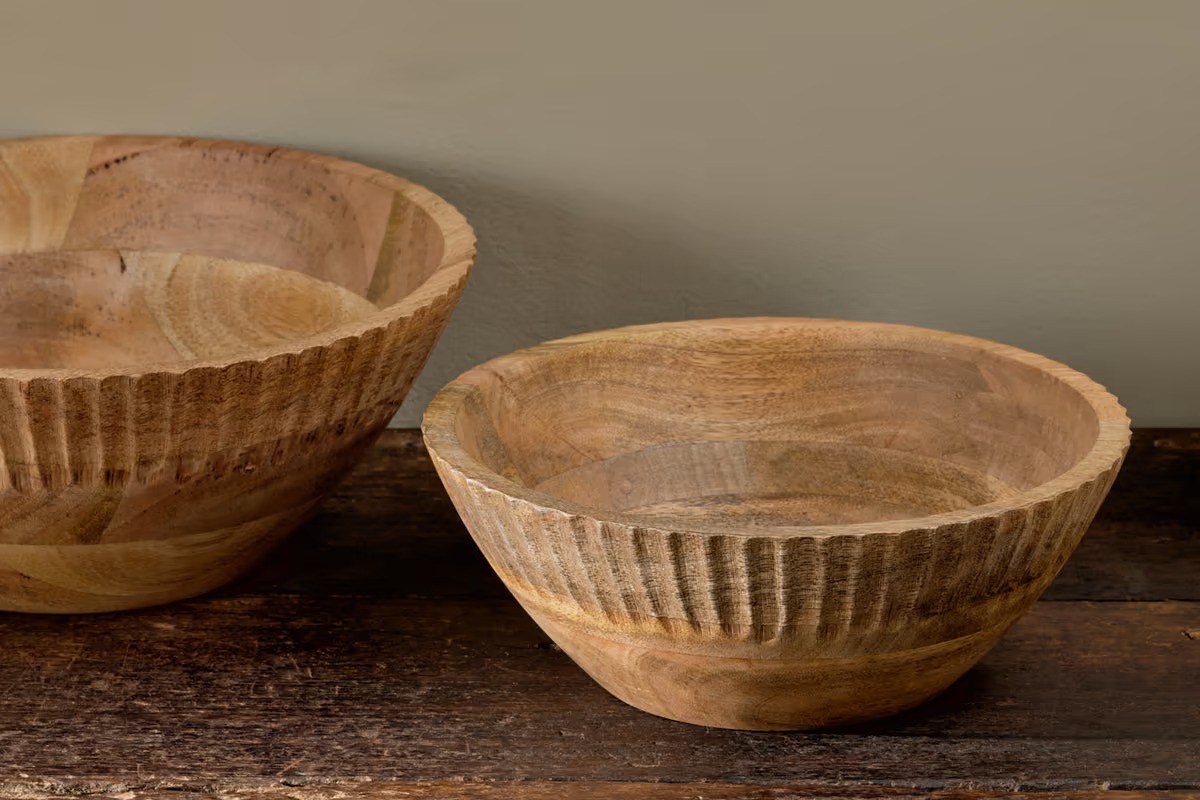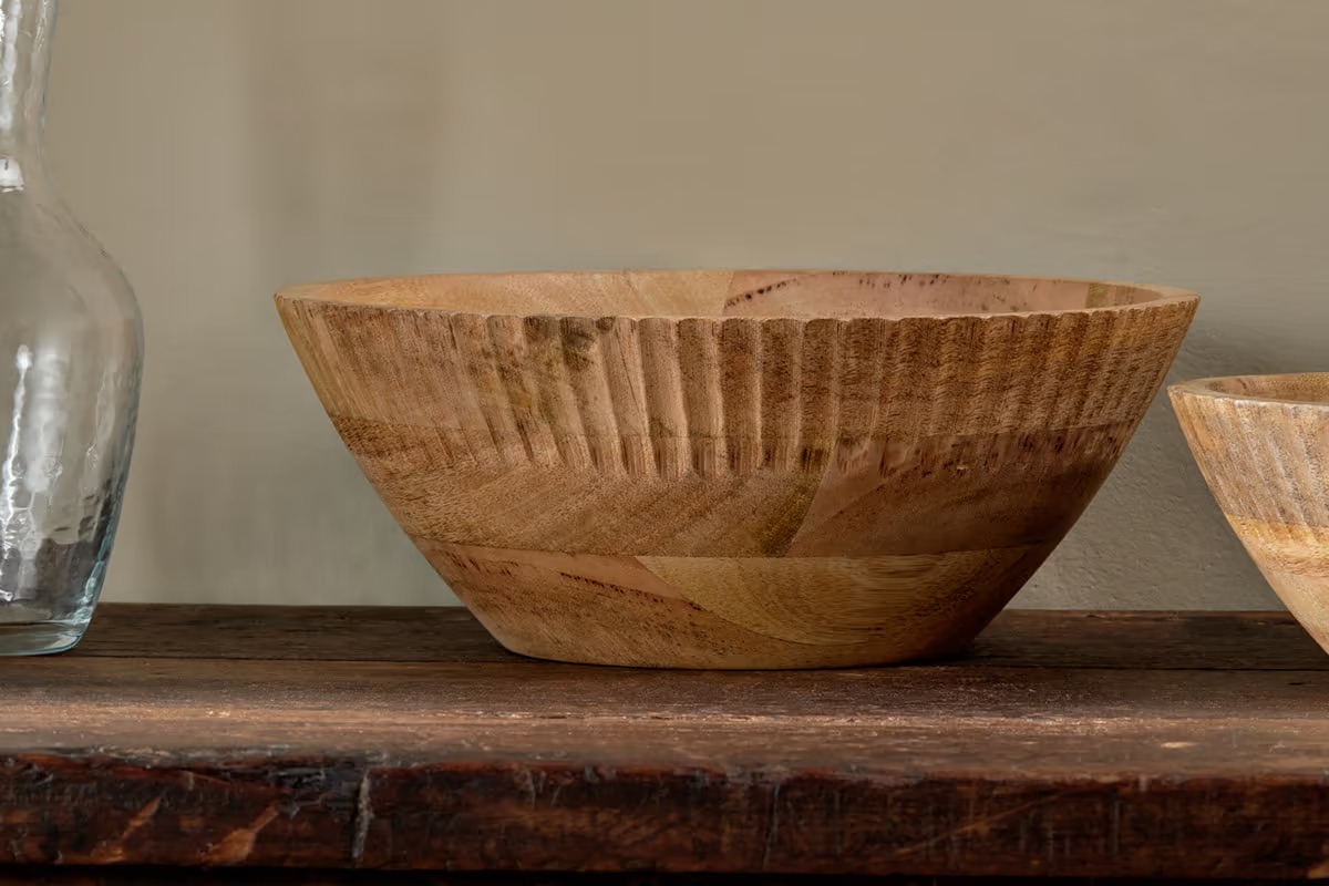 The decorative hand-carved etching that adorns the edge of the Gavivi serving bowl adds a simple yet strikingdesign detail. The etching process naturally creates a two-tone effect by highlighting the natural variety found withinthe wood's grain, creating a tactile and textured piece that is at once effortlessly eye-catching and utterly functional