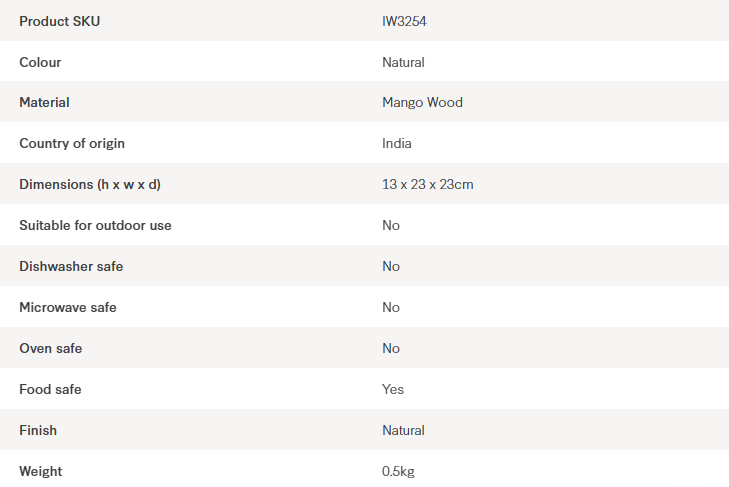 The mango wood used is sustainable and FSC certified. Mango trees are initially grown for their fruit but once thetrees reach a certain size and age, they stop bearing frult. it is then that the trees can be cut down and used to createwood products. lhe removal of the old trees makes space for farmers to plant new mango trees. This not only meansthat none of the wood is wasted but offers a supplementary income to mango wood farmers.