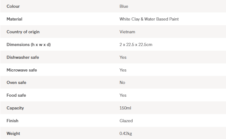 Our simple, vet stunning Indigo Drop ceramic plates are handmade in Vietnam, using age-oldtraditions that have remained unchanged for generations. This plate forms part of our Indigo DropTableware collection. Each piece is hand painted with the beautiful Indigo Drop design. Thecollections are painted and shaped by hand incorporating indigenous and contemporary influences.