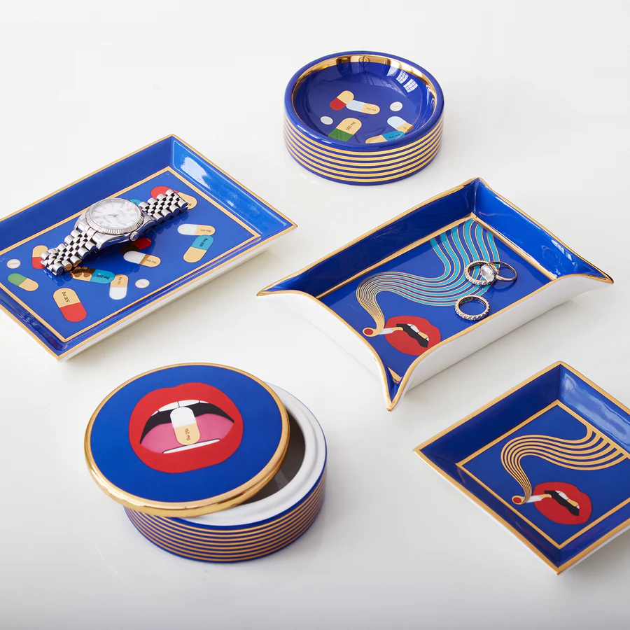 Sexy, seductive and saucy, our petite trays are the little quelque chose you didn't know you needed but absolutely do. Add a kiss of tough glam to your bedside, bathroom, or tabletop. Crafted from high-fired porcelain with real gold accents. Indulge yourself or give one as a gutsy gift—our Full Dose set comes packaged in a nifty box.