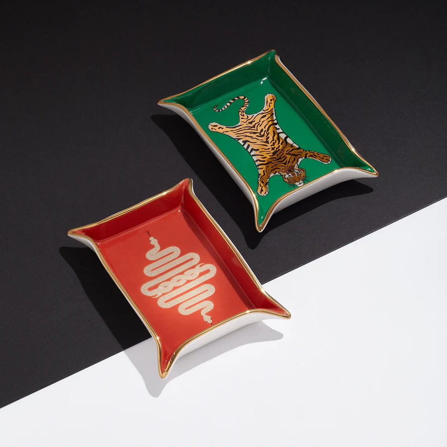 We updated the classic form of a leather valet tray in posh porcelain. In bold emerald, our Tiger Tray features a dangerously divine tiger rug shape that looks fab on an entryway table or as a bedside catchall for your precious jewels. Packaged in a nifty gift box, it makes a perfect hostess present (or pick-me-up for yourself).